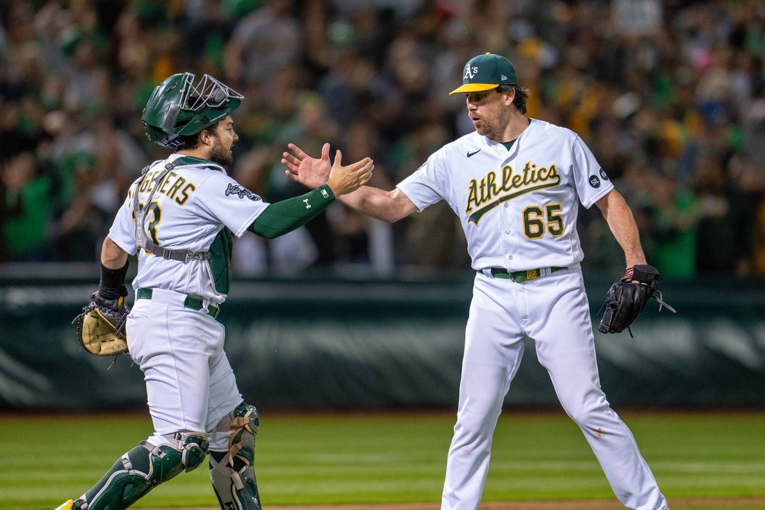 With 27,759 mostly green-and-gold-clad fans — many donning “SELL” T-shirts as a message to owner John Fisher, who plans on moving the team to Las Vegas — creating a postseason-type ruckus, the A’s rallied from a 1-0 hole with single runs in the seventh and eighth innings to stun the team with the best record in baseball for the second consecutive night.