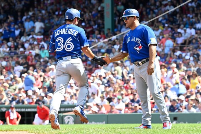 Davis Schneider had four hits, including a two-run home run, and drove in four runs on Sunday to help the visiting Toronto Blue Jays complete a three-game sweep by beating the Boston Red Sox 13-1.
