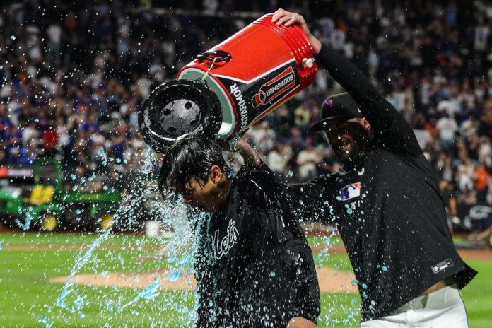 Jonah Tong tossed five solid innings and earned the win in his major league debut Friday night, when the New York Mets provided him a historic burst of run support in a 19-9 rout of the visiting Miami Marlins.