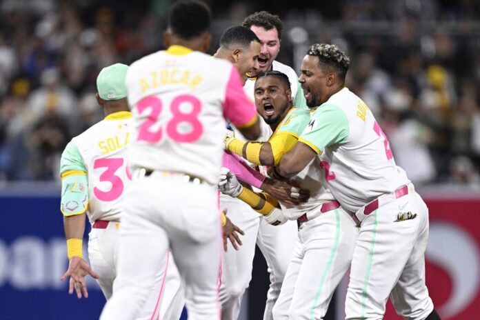 Luis Campusano started the inning with his and the team’s second hit of the game, a double into the left field corner off Michael Grove (1-2). After Ha-Seong Kim struck out, Arraez laced a first-pitch fastball into center field and pinch runner Tyler Wade easily beat the throw home. Robert Suarez (2-0) worked a 1-2-3 top of the ninth for the win.