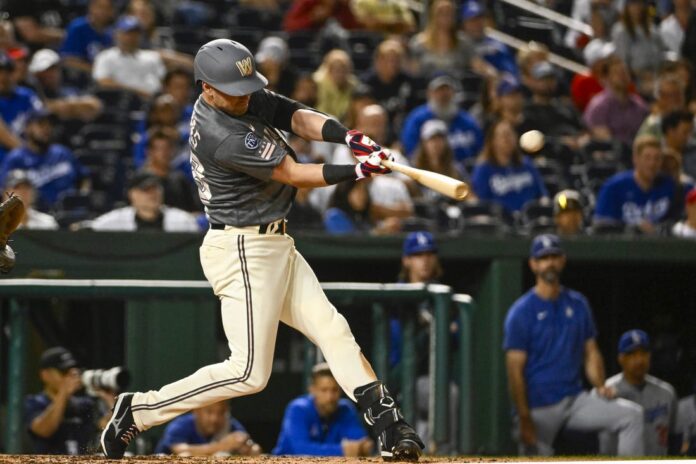 The Dodgers tied the game in the ninth off Nationals closer Kyle Finnegan on Kolten Wong’s one-out single. James Outman reached on a one-out walk, stole second base and went to third on catcher Ruiz’s throwing error.