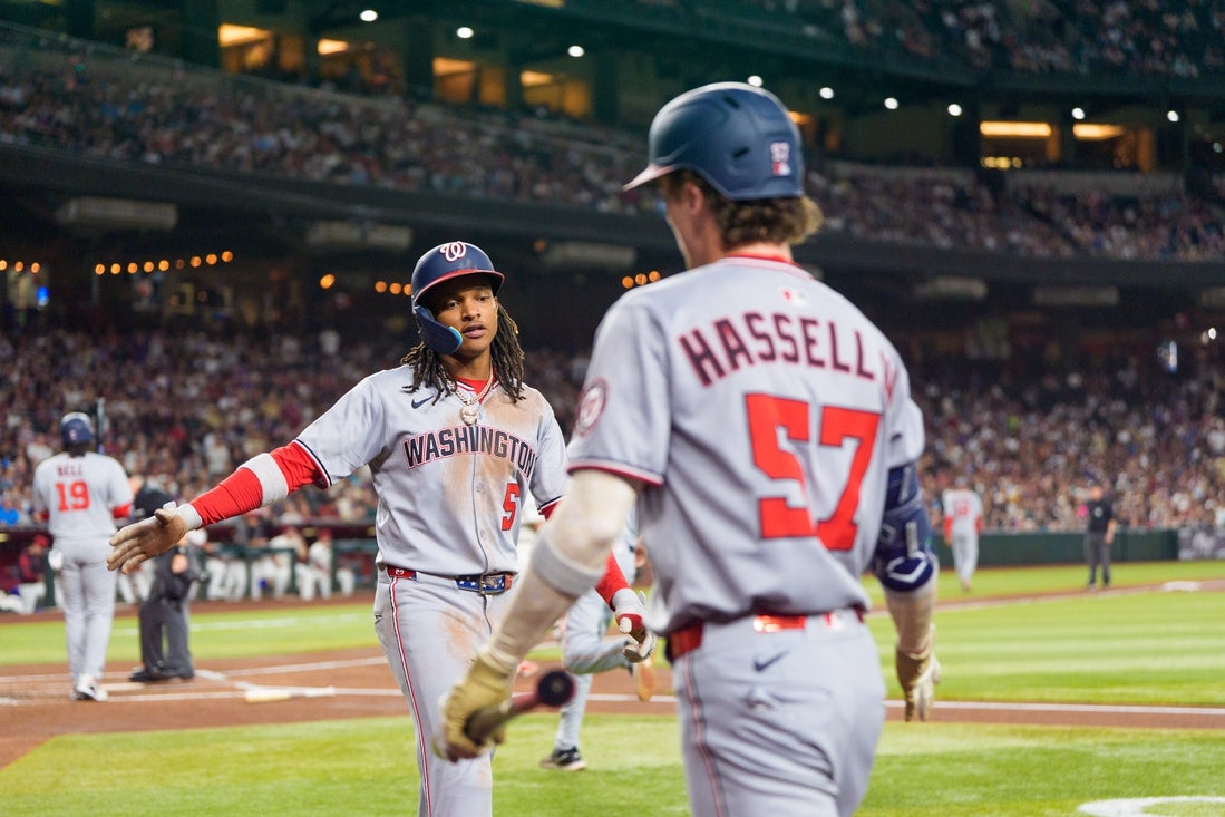 The Nationals scored their 10 first-inning runs on nine hits — five doubles — on Saturday night. James Wood and Robert Hassell III each had two hits in the first, Luis Garcia, Jr. and Keibert Ruiz hit two-run doubles, and CJ Abrams twice was hit by a pitch.