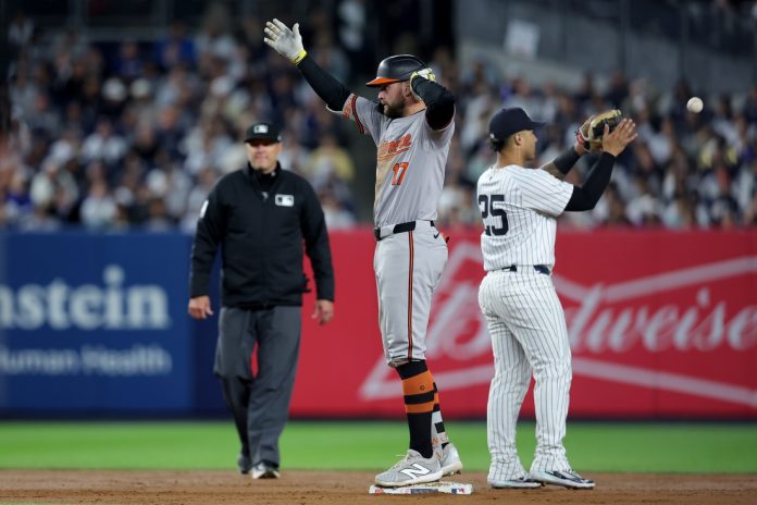 Cowser wound up with a two-run single in the first when New York rookie left fielder Jasson Dominguez could not make a leaping catch, and he scored on a single by Ryan Mountcastle after stealing second.