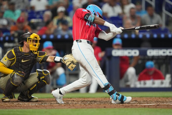 Both Arraez and Scott were traded by the Marlins to the Padres this year. Arraez went 2-for-6 with three RBIs. Scott pitched one scoreless inning, striking out Jake Burger with two runners on to end the game to pick up his first save for San Diego and 19th of the season.