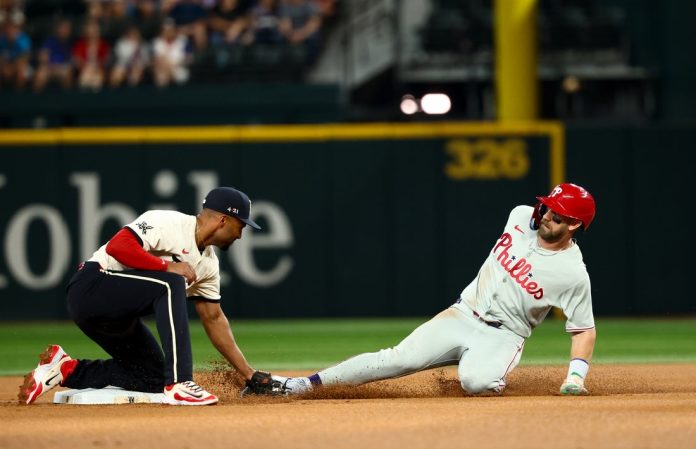 The Phillies added five insurance runs in the ninth off Texas reliever Luis Curvelo. Stott hit a two-run, two-out double to score Nick Castellanos and Max Kepler, and Turner followed with a three-run homer that plated Edmundo Sosa and Stott.