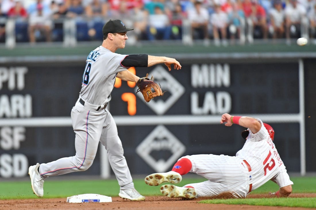 The Phillies went ahead 1-0 in the first inning when Alec Bohm reached second base on a fielding error by right fielder Bryan De La Cruz and scored on an RBI double by Realmuto.