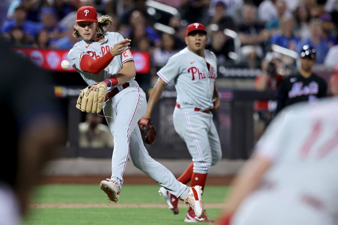 Automatic runner Bryson Stott went to third on a groundout by Rhys Hoskins. Bohm followed with a flyout to right. Stott tagged up and would have been out with an accurate throw by Starling Marte, but the one-hopper glanced off the glove of Tomas Nido as Stott slid across the plate.