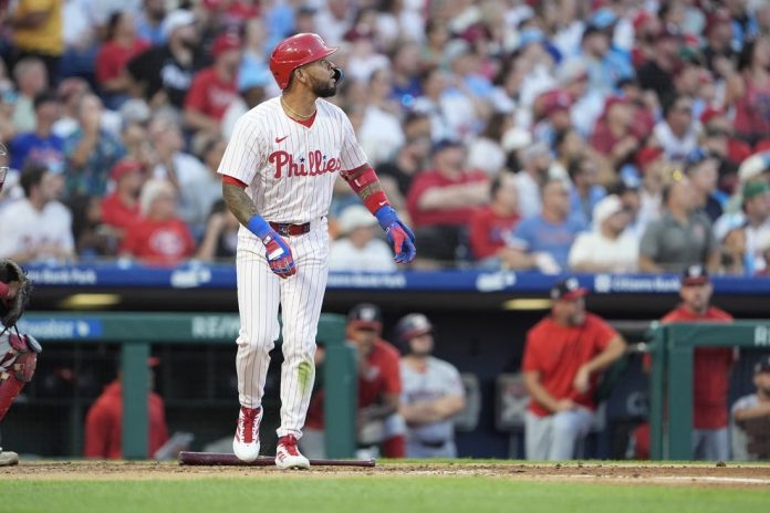 After throwing out James Wood at second base to end the third inning, Realmuto opened the scoring with one out in the fourth. Bryce Harper singled for the Phillies’ first hit of the game and came around to score on Realmuto’s double to left-center field.