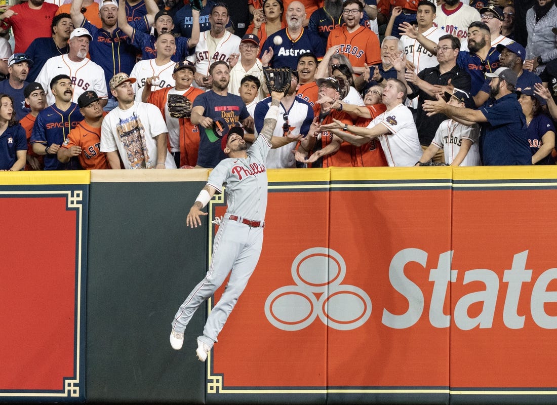 Kyle Schwarber, who homered off Houston ace Framber Valdez in Game 6 of the World Series, got Valdez again on Friday, belting a 407-foot blast to right field in the first inning. And Nick Castellanos, whose defense paved the way for the Phillies to win Game 1 of the Fall Classic, robbed Alex Bregman of a homer with a catch at the right field wall to end the bottom of the first on Friday.