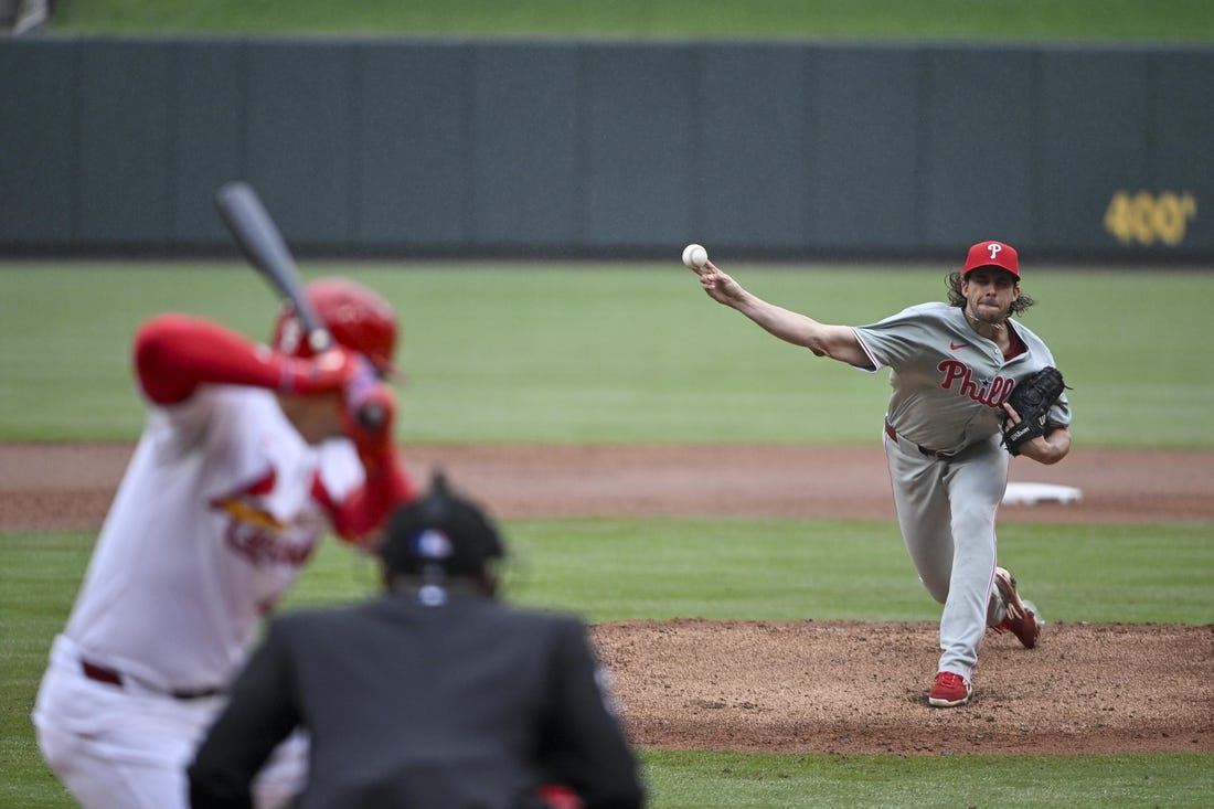 Aaron Nola allowed two runs on three hits over six innings as the visiting Philadelphia Phillies edged the St. Louis Cardinals 4-3 on a rainy Wednesday afternoon.
