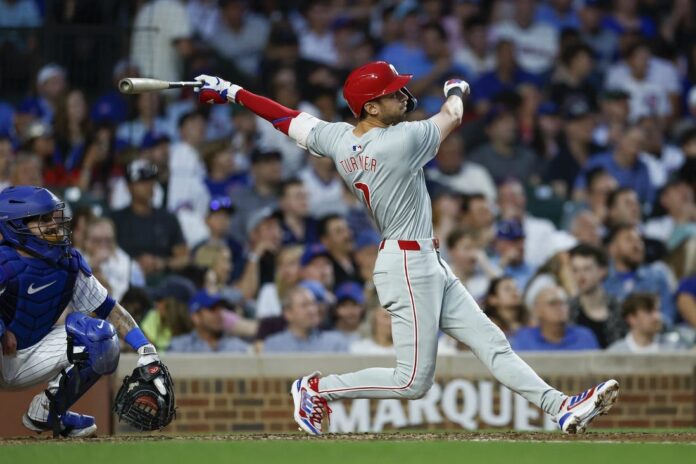 Turner hit 861 feet of homers in Philadelphia’s 6-4 victory over the Cubs in Tuesday’s opener of the three-game series. That gives Turner five homers in 46 games this season.