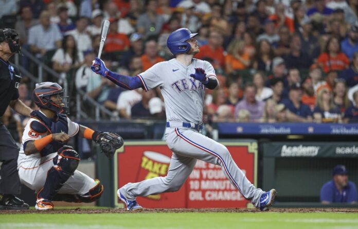 Heim was injured while swinging at a pitch from the Houston Astros’ Framber Valdez in the fourth inning on Wednesday.