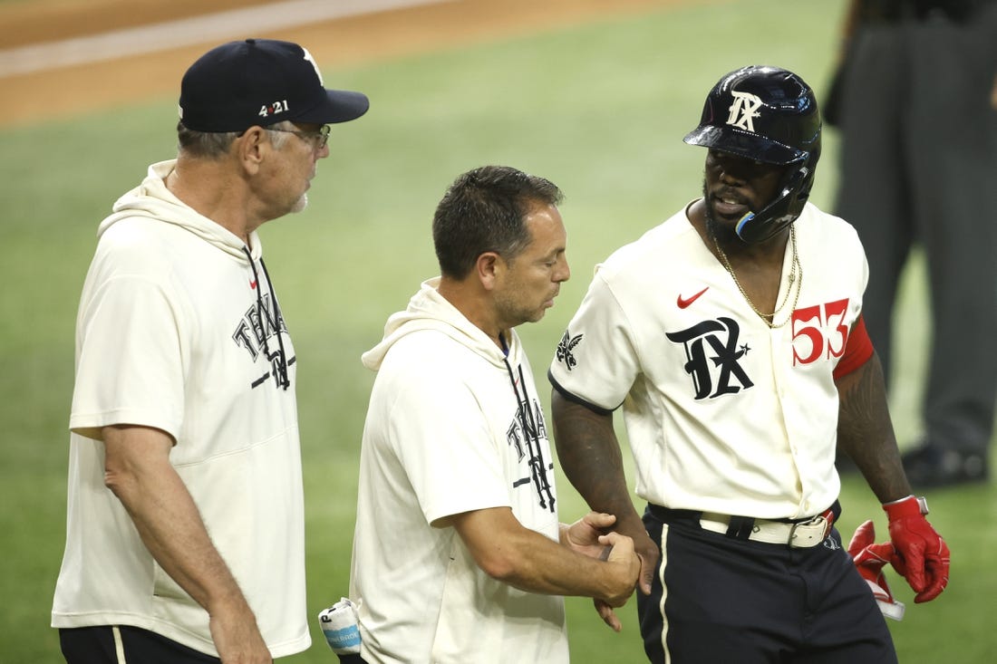 Texas Rangers All-Star outfielder Adolis Garcia exited Saturday’s game against the Los Angeles Dodgers after being plunked by a pitch on his right hand.