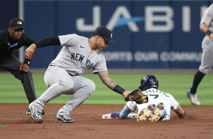 The Yankees took a 1-0 lead in their half of the first. Gleyber Torres hit a two-out RBI single that fell just in front of left fielder Randy Arozarena, scoring Juan Soto from third.