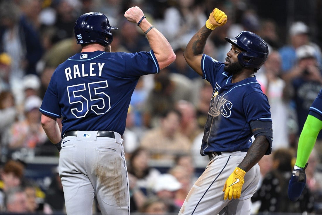 Taylor Walls opened the inning with a double and scored on a single by Jose Siri, who stole second before being thrown out at third trying to advance on a grounder by Yandy Diaz. After Wander Franco fouled out, Diaz advanced to third on Raley’s second straight double — a line drive to center that bounced off the glove of Trent Grisham. Arozarena followed with a 402-foot drive to center, a three-run shot.