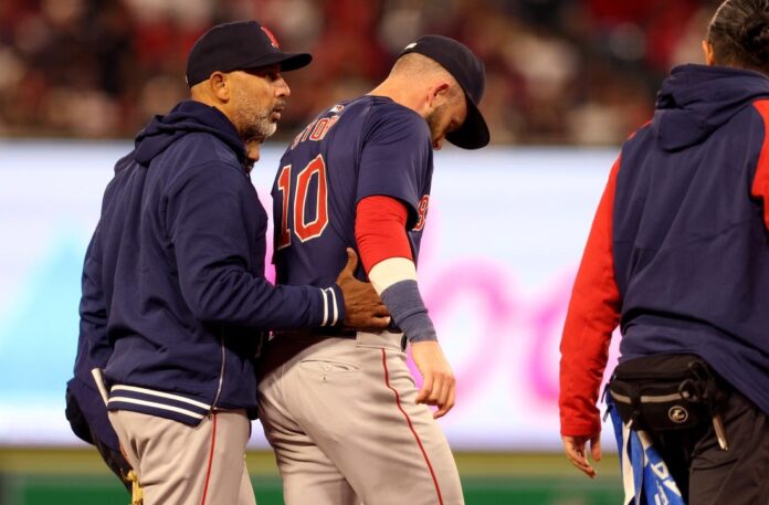 The 31-year-old infielder left in the fourth inning of Boston’s 8-6 win over host Los Angeles after making a diving stop on Mike Trout’s hard grounder.