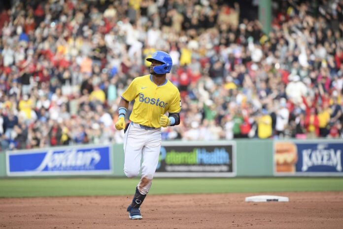 Masataka Yoshida matched Rafaela with four hits as the Red Sox piled up 21 as a team. Tyler O’Neill began the scoring with his ninth home run of the season on his 3-for-5 day, while Bobby Dalbec drove in three.