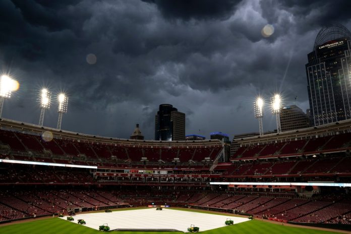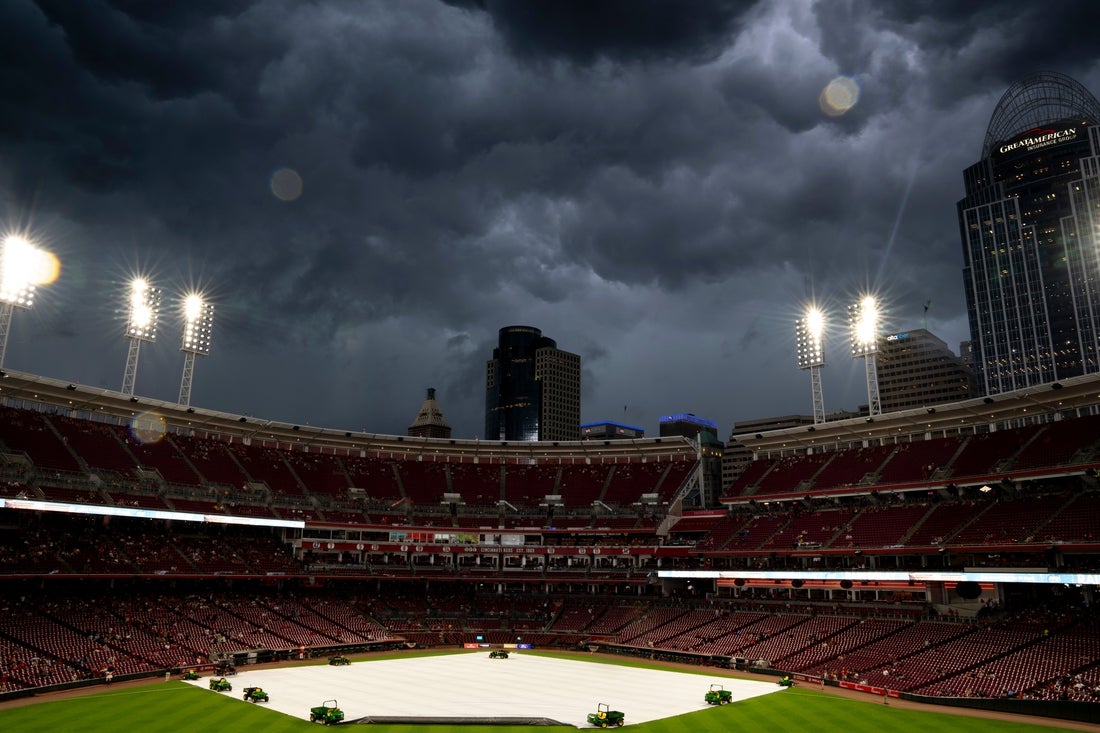 The start of the game was delayed due to torrential rains and gusting winds that put the field under an inch of water in some places. It took the grounds crew 45 minutes to prepare the field once the tarp was removed.