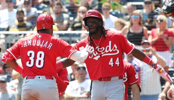 Spencer Steer, Miguel Andujar and Noelvi Marte all hit homers and combined to drive in 11 runs to help the Cincinnati Reds outlast the host Pittsburgh Pirates 14-8 in a shootout win on Sunday afternoon.