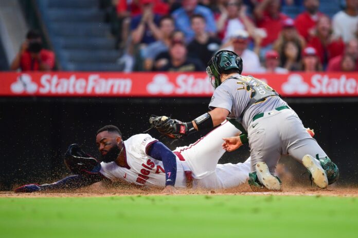 The ball one-hopped the wall, Rendon reaching second with a double and Adell being waved home by third base coach Eric Young. Oakland second baseman Zack Gelof made a perfect relay throw to catcher Shea Langeliers, cutting down Adell at the plate.