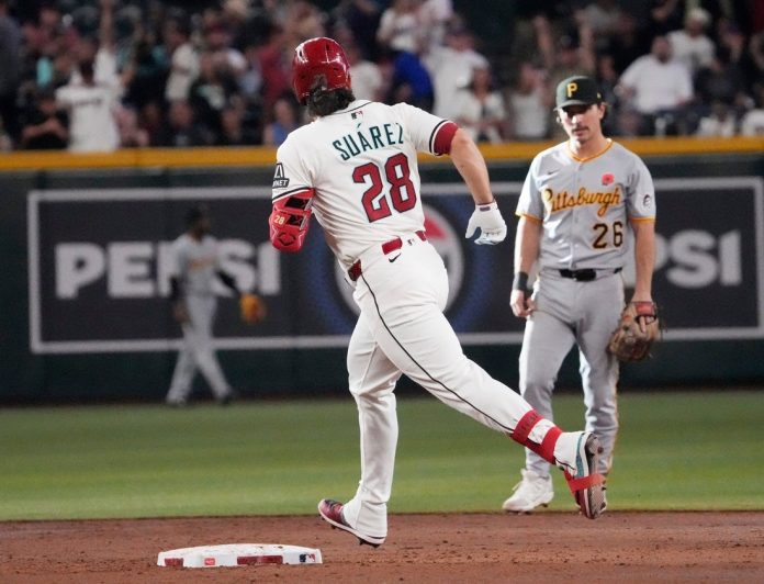 Suarez’s 433-foot homer made it 3-0 in the fourth. It was his 15th, tying him with teammate Corbin Carroll for third in the National League.