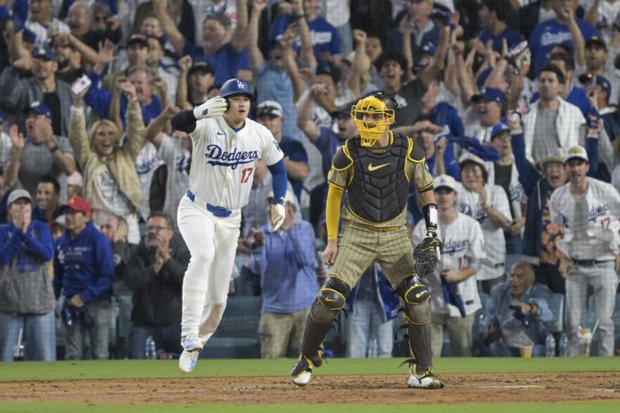 LOS ANGELES — Shohei Ohtani hit a three-run home run in the first playoff game of his career and the Los Angeles Dodgers rallied for a 7-5 victory over the San Diego Padres on Saturday in Game 1 of their National League Division Series.