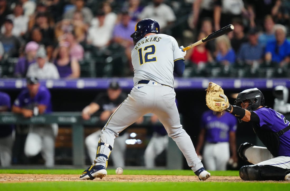 The Brewers snapped a six-game Coors Field losing streak — a skid that had dated to Sept. 6, 2022 — with a 4-3 victory over the Colorado Rockies on Tuesday night as Rhys Hoskins knocked in the winning run with a two-out, bases-loaded hit-by-pitch in the ninth inning.