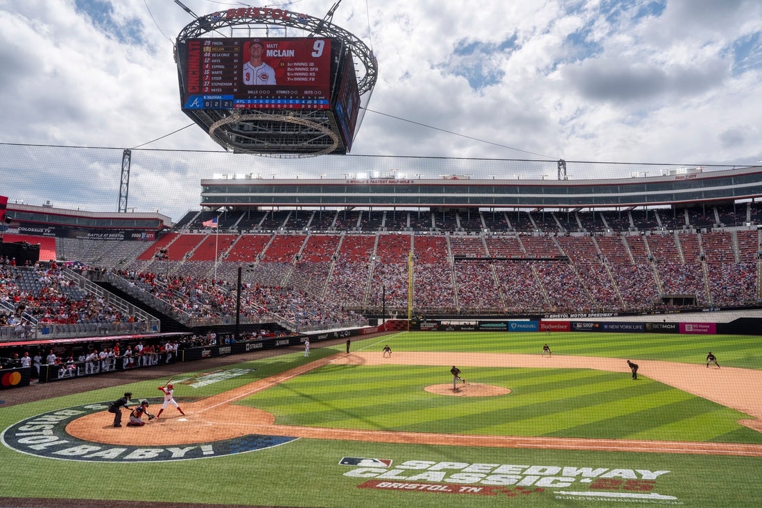 Some 91,032 tickets were sold as the Atlanta Braves put away the Cincinnati Reds 4-2 on Sunday after the game was postponed from Saturday at Bristol Motor Speedway in Tennessee — setting the MLB regular-season record set 71 years ago.
