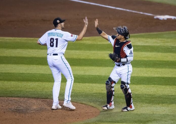 Ryan Thompson, whose contract was selected by the Diamondbacks from Triple-A Reno earlier Sunday, retired the side in the ninth for the save.