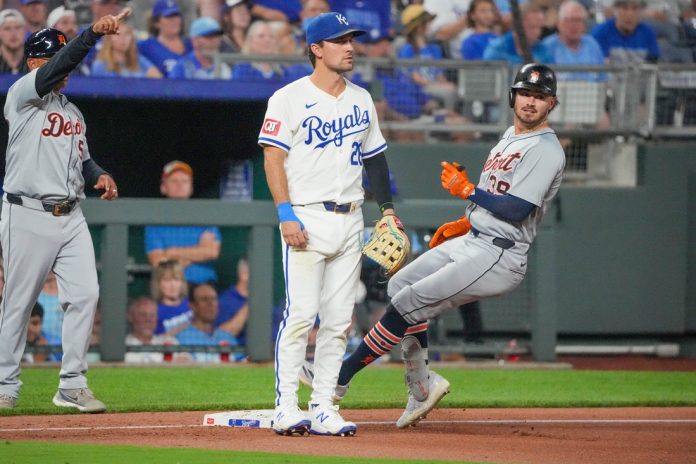 Matt Vierling’s sixth-inning single capped a rally that carried the visiting Detroit Tigers past the Kansas City Royals 7-6 on Monday in the opener of a three-game series.