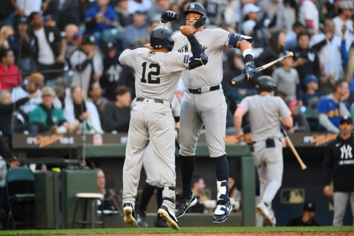 Trailing 2-1, the Yankees took the lead with a six-run fifth off Mariners starter Emerson Hancock (1-2).