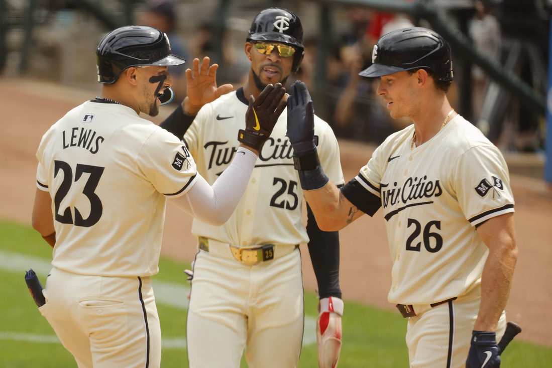 Following another double by Byron Buxton, Lewis hit an opposite-field homer to right to stretch the lead to 7-0.