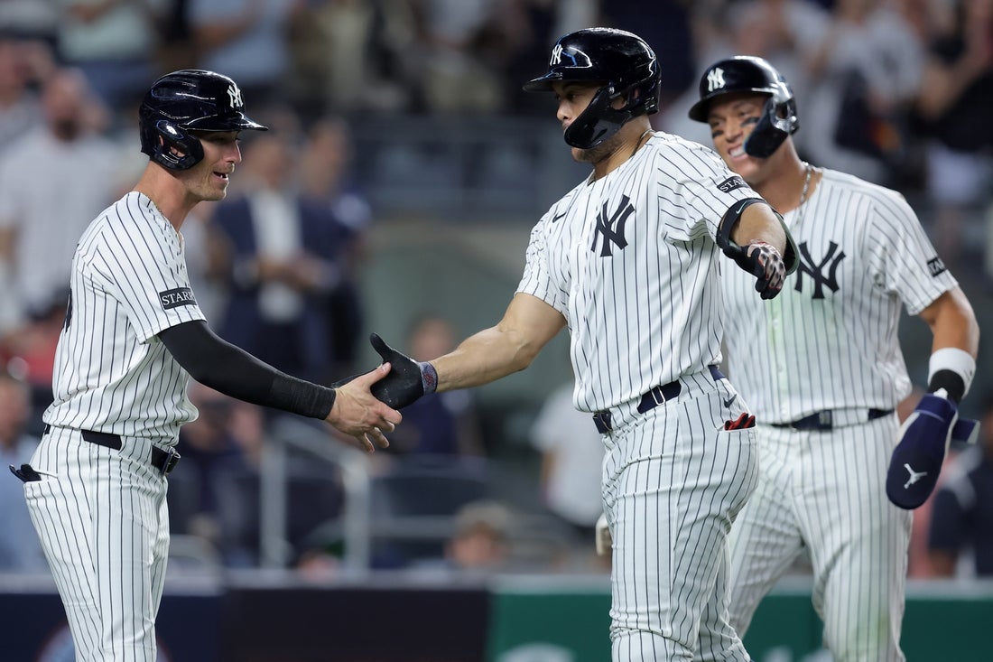 Giancarlo Stanton hit a three-run homer in the sixth inning, Aaron Judge added his 34th homer an inning later and the New York Yankees roughed up Logan Gilbert after a rain delay in a 10-3 victory over the visiting Seattle Mariners on Tuesday night.