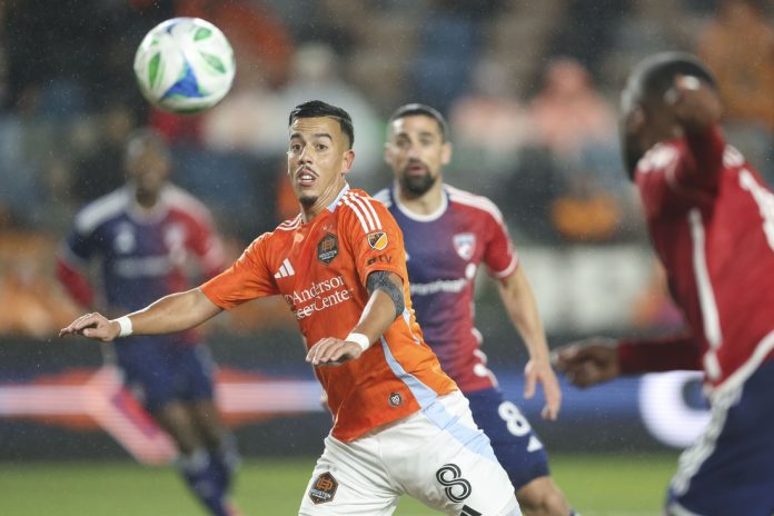 After solid scoring chances for both sides in the early minutes, the Dynamo found the net in the 18th minute, with Amine Bassi pouncing on a rebound of a header by Ezequiel Ponce and using his head to bounce a shot past Dallas goalkeeper Maarten Paes and into the net.