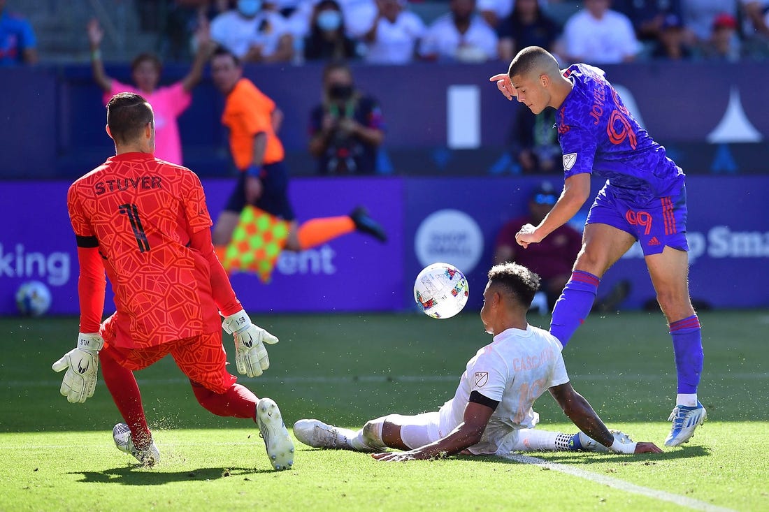 Defender Zan Kolmanic reached it first but struck his clearance attempt straight into Joveljic’s chest. Joveljic controlled the ball and slotted it easily past Stuver to give LA the lead.