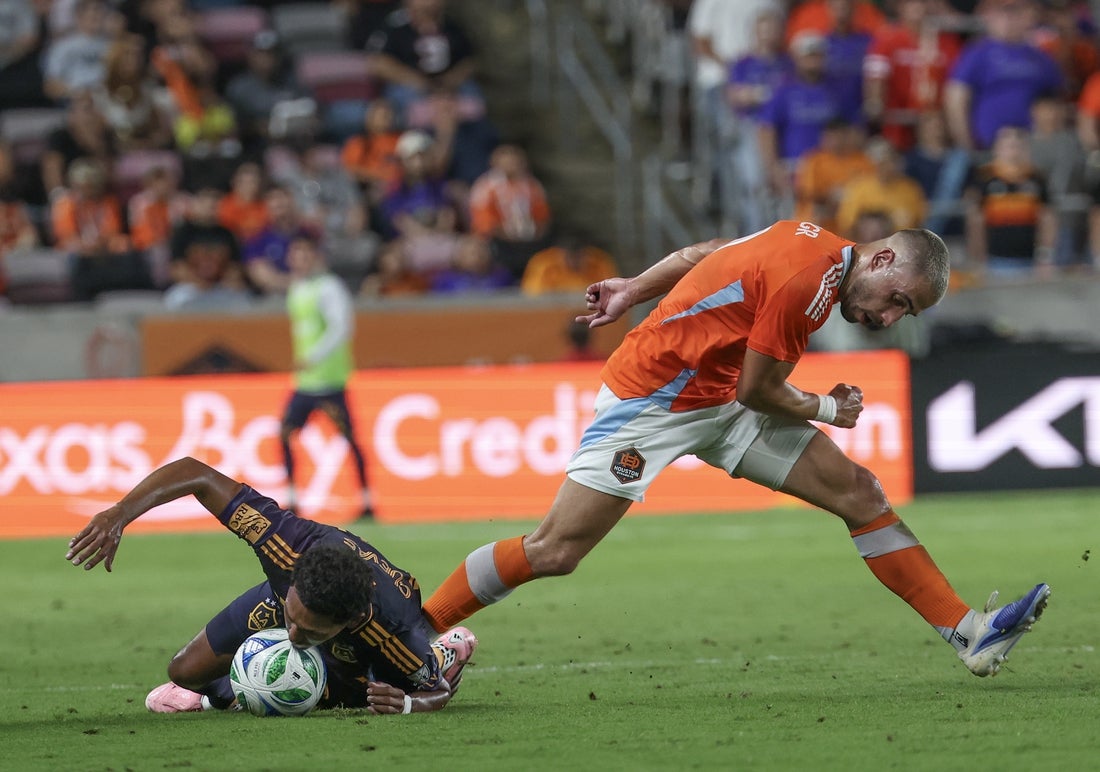 Lawrence Ennali had two splendid opportunities to add to Houston’s lead before the halftime whistle. A crafty progressive run from midfielder Junior Urso wound up on his feet in stoppage time, only for both of his strikes to be blocked by Galaxy defenders John Nelson and Mauricio Cuevas in close succession.