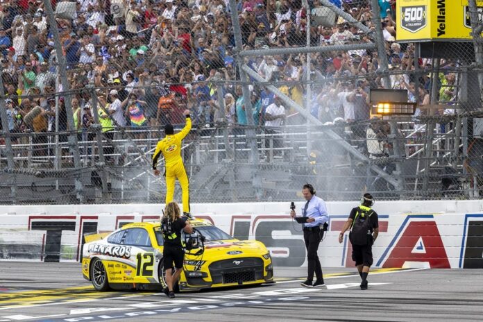Blaney made a last-lap pass of Kevin Harvick in a wild finish Sunday to win the YellaWood 500 NASCAR Cup Series playoff race at Talladega Superspeedway in Talladega, Ala.
