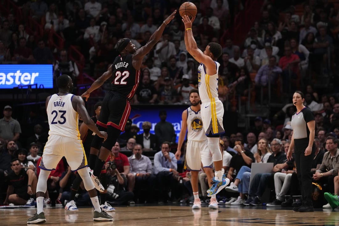 Warriors star Stephen Curry thought he was headed to the free-throw line for three shots when a foul was called on Jimmy Butler on a 3-point attempt. But after review, the refs overturned the call, awarding the ball to Miami, saying Butler’s contact came after he got a hand on the ball.
