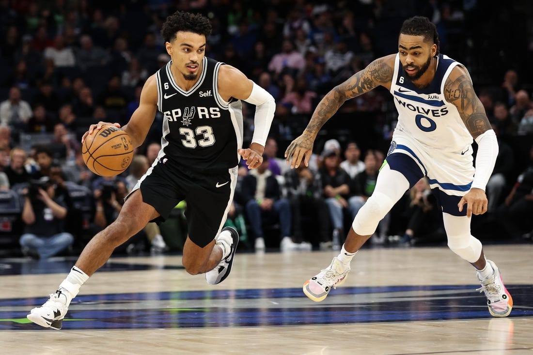 Devin Vassell scored 23 points to lead six Spurs in double figures as San Antonio beat the Minnesota Timberwolves 115-106 on Monday in the opener of a two-game series between the teams in Minneapolis.