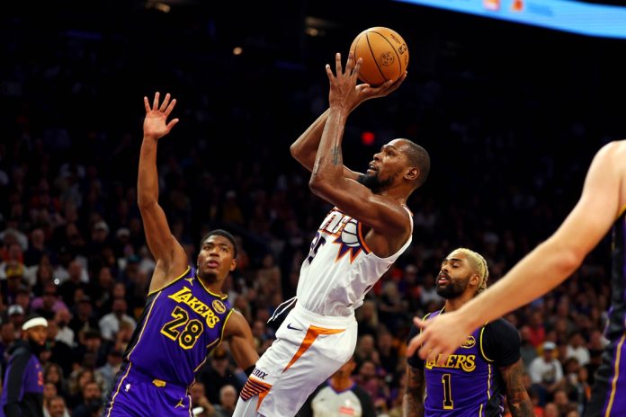 Devin Booker scored 33 points and Kevin Durant added 30 points, eight rebounds and four blocked shots to lead the host Phoenix Suns to a 109-105 victory over the Los Angeles Lakers on Monday night.