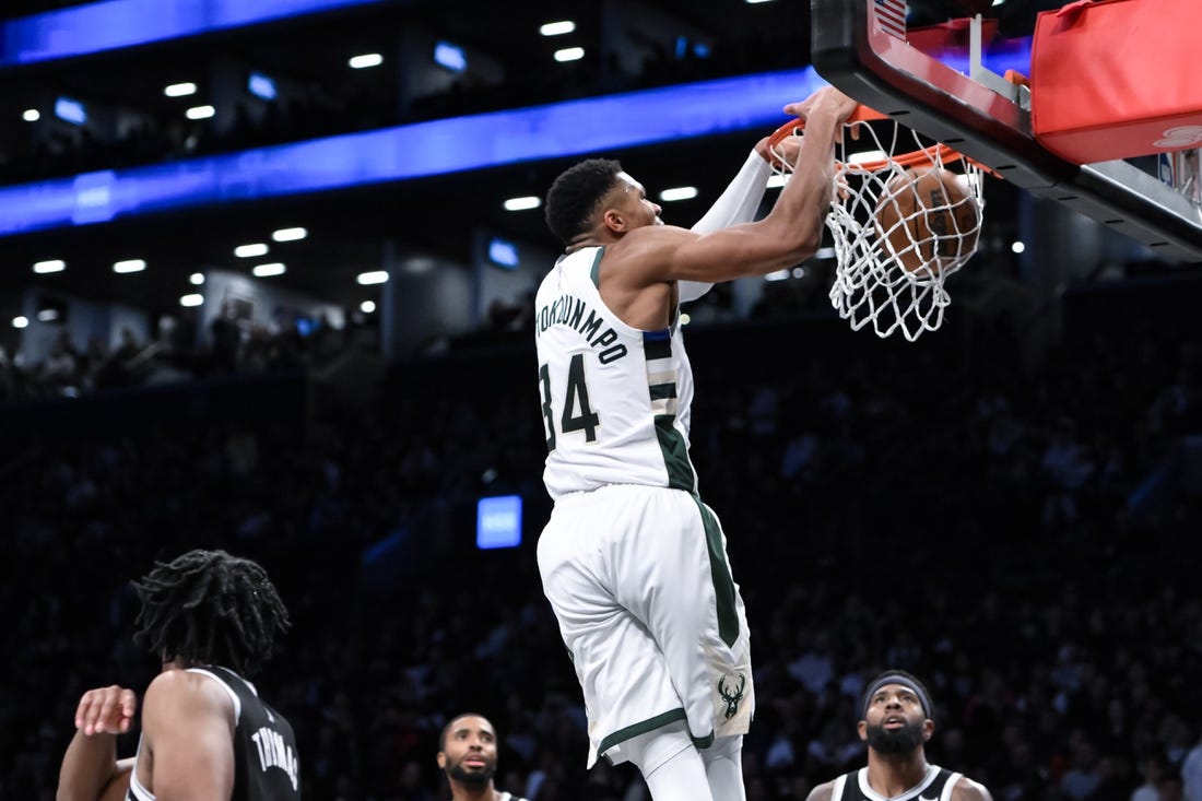 Giannis Antetokounmpo scored 36 points and hit the tiebreaking dunk with 71 seconds remaining as the Milwaukee Bucks outlasted the Brooklyn Nets 129-125 on Monday night in New York.