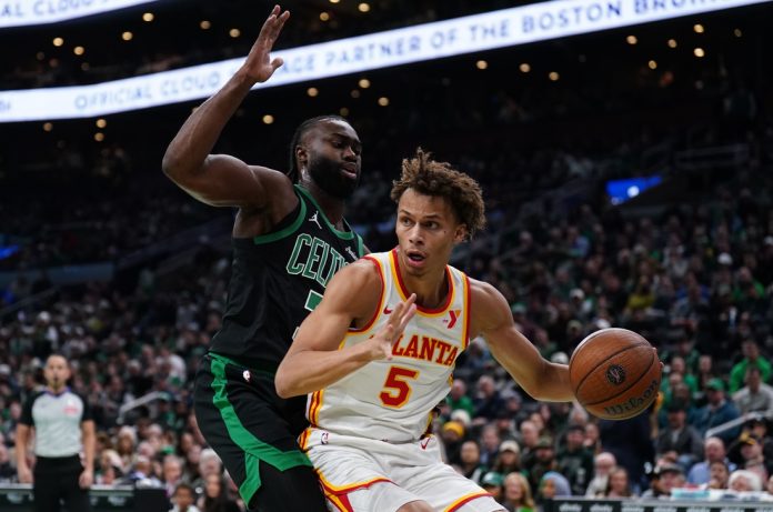 Jalen Johnson had 18 points, 13 rebounds, 10 assists and three steals to lead the visiting Atlanta Hawks to a 117-116 victory over the Boston Celtics on Tuesday in the first NBA Cup game for each team.