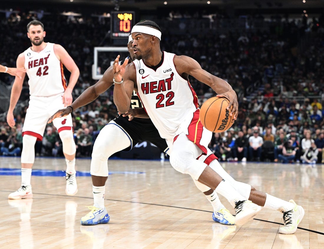Jimmy Butler had 35 points and 11 assists and the visiting Miami Heat defeated the Milwaukee Bucks — who played most of the game without Giannis Antetokounmpo — 130-117 in Game 1 of an Eastern Conference first-round playoff series Sunday.