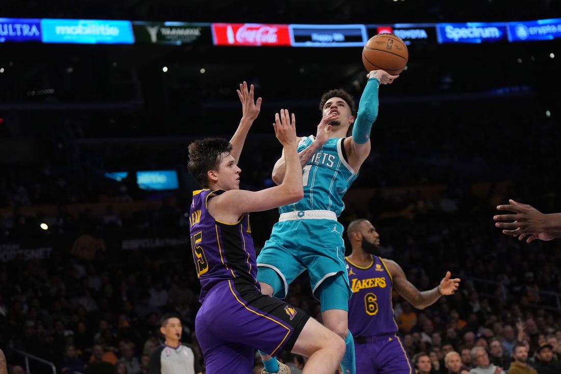 P.J. Washington scored 24 points and LaMelo Ball and Terry Rozier added 23 apiece as the visiting Charlotte Hornets shot a season-best 55.3 percent from the field and held on for a 134-130 victory over the Los Angeles Lakers on Friday.