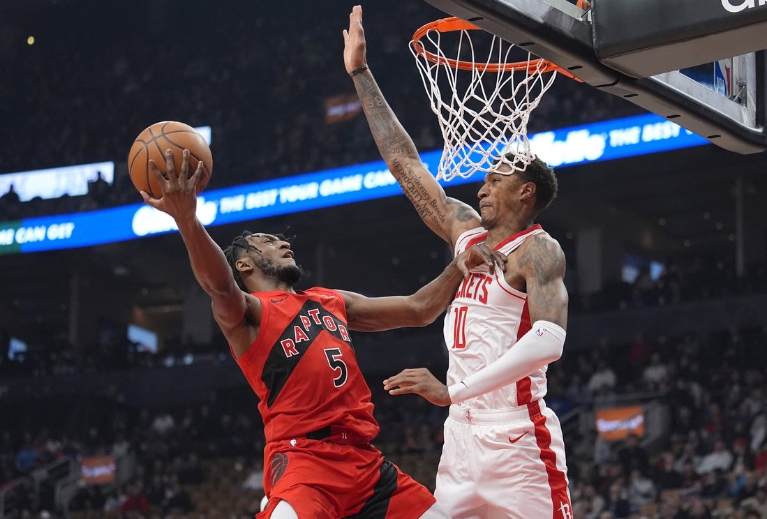 The Raptors’ success from 3-point range and Barrett’s shot from beyond the arc tied the game at 50. Consecutive 3-pointers from Jamal Shead and Ingram thrust Toronto into a 56-52 lead with 5:10 remaining in the half. The Rockets stepped up their energy level and finished the half on an 11-0 run to lead 70-63.