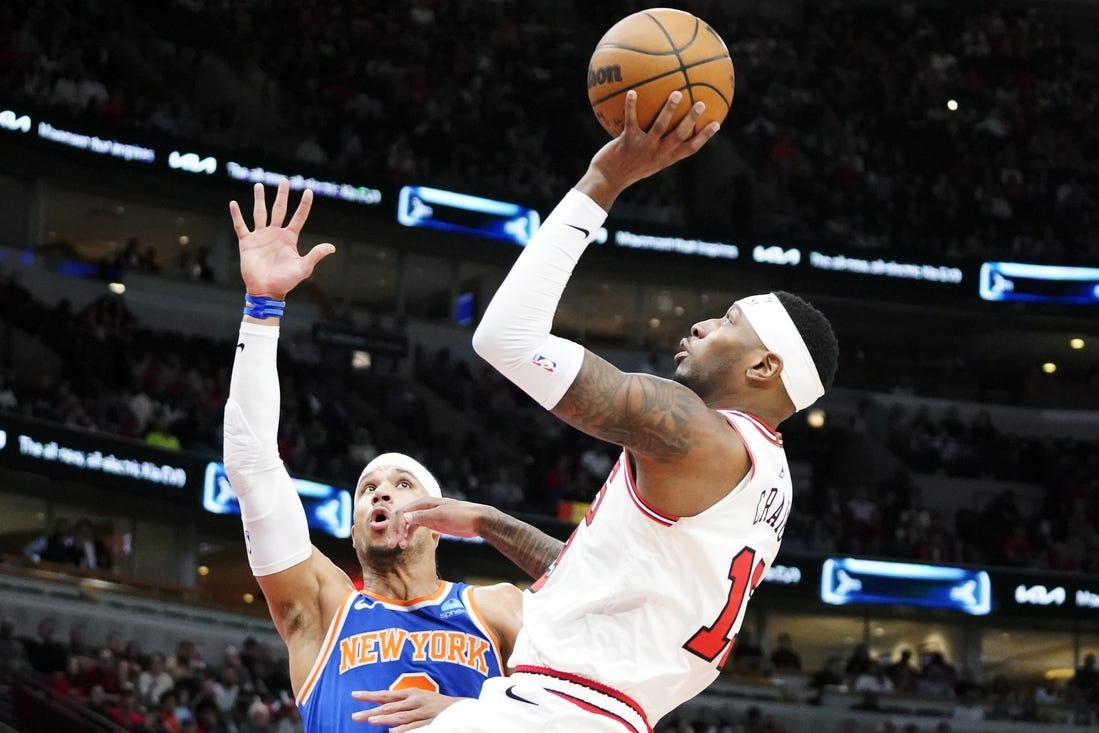 The Knicks led by as many as 17. The Bulls trimmed their deficit to four points on a Nikola Vucevic layup with 7:54 left in the game but couldn’t match New York’s depth down the stretch.