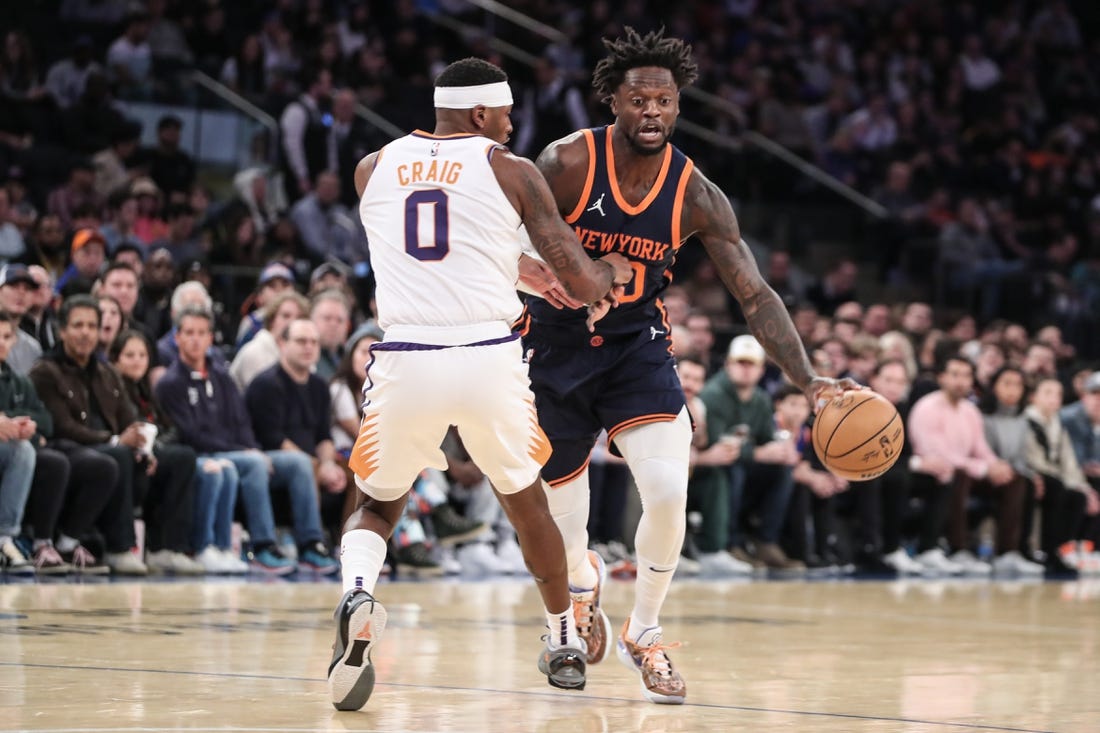 Julius Randle led all players with 28 points and 16 rebounds and Jalen Brunson scored eight of his 24 points during a decisive second-quarter run Monday afternoon for the host New York Knicks, who rolled to a 102-83 win over the Phoenix Suns.