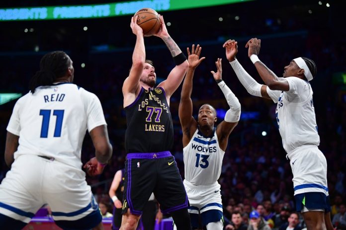 Luka Doncic posted 31 points, 11 rebounds and 11 assists as the Los Angeles Lakers earned a 120-106 victory over the visiting Minnesota Timberwolves on Tuesday in a battle of playoff-hopeful Western Conference teams.