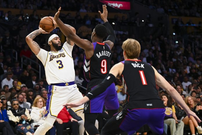 Davis blocked a shot attempt by the Raptors’ Jakob Poeltl near the basket before Poeltl’s left hand connected with Davis’ face.