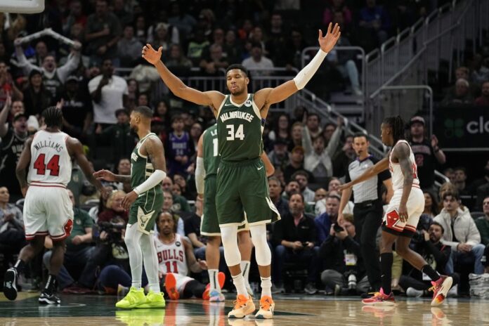 Giannis Antetokounmpo had 32 points, 12 rebounds and six assists to help the Milwaukee Bucks outlast the visiting Chicago Bulls 133-129 in overtime on Monday.